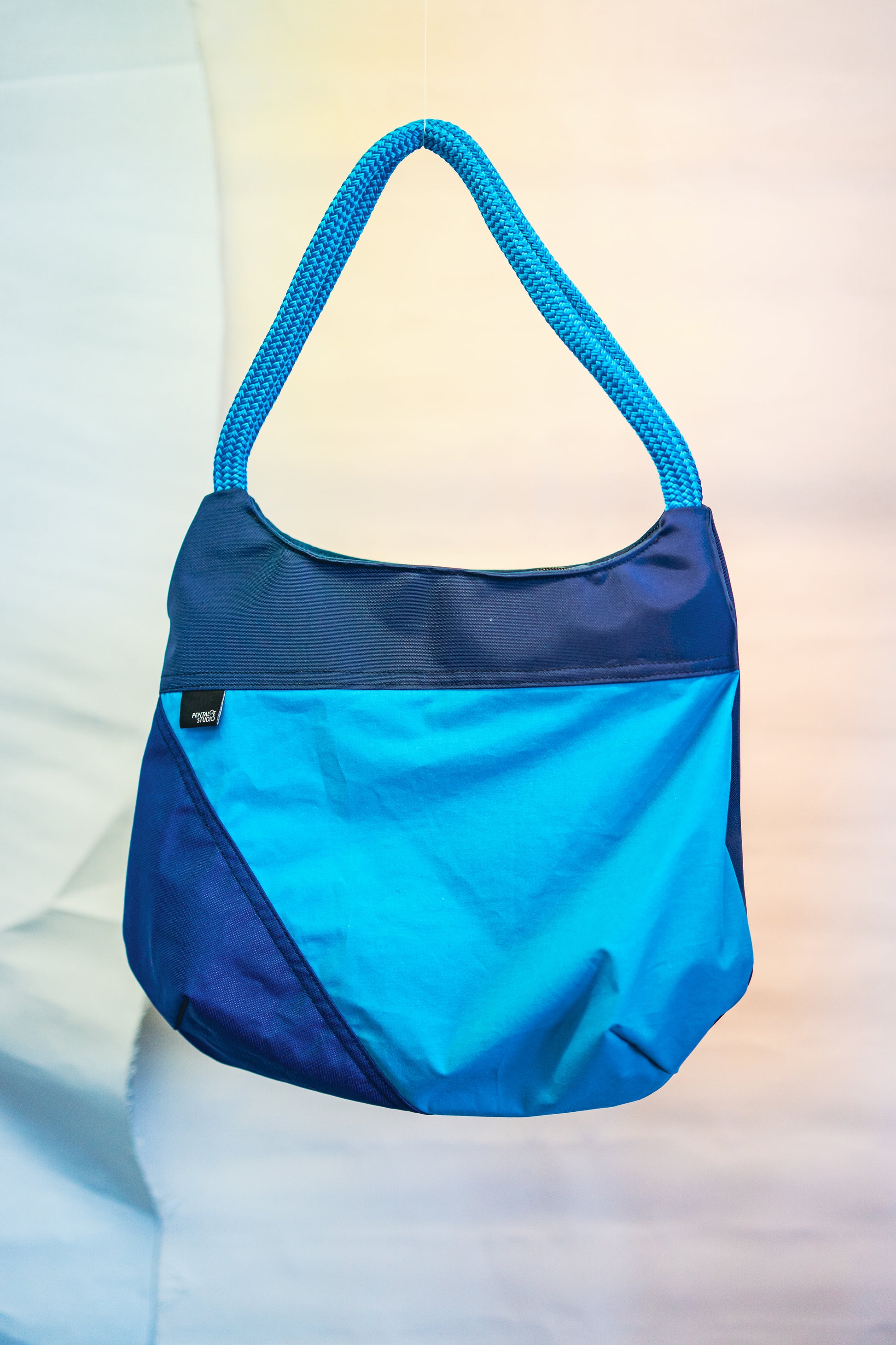Large single pocket tote tote with zip closure. Handles made from upcycled sailing rope.